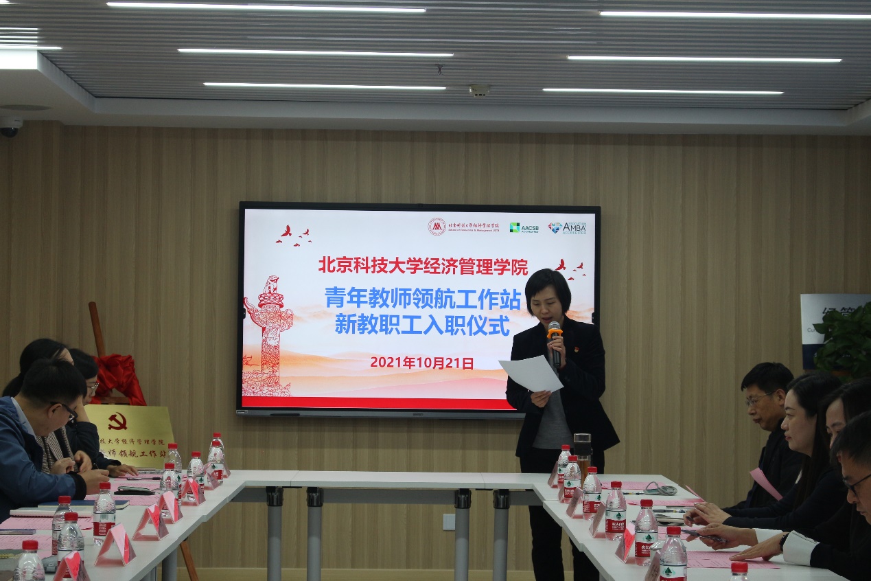 2021年10月21日下午,北京科技大学江南在线注册青年教师领航工作站新教职工入职仪式在经管楼1205隆重举行。学校党委副书记、纪委书记戴井岗,学院领导班子成员、全体成长导师和全体新入职青年教职工参加了大会。会议由学院副院长、副书记温雅主持。
