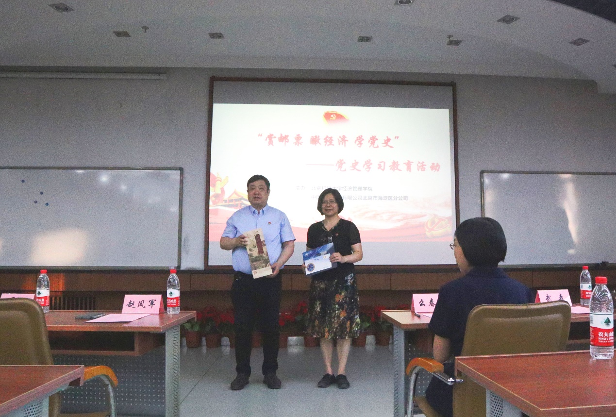 活动伊始,中国邮政集团有限公司北京市海淀区分公司与北京科技大学经管学院互赠纪念礼物。