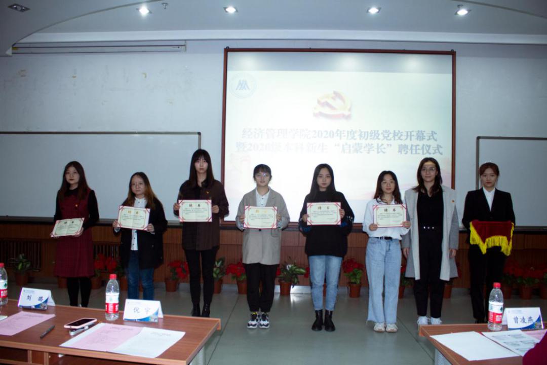 初级党校为学员聘请了高年级优秀党员作为他们成长路上的“启蒙学长”,党校班主任王琳茹为“启蒙学长”代表颁发了聘书,正式搭建起启蒙学长们和20级新生的交流平台。