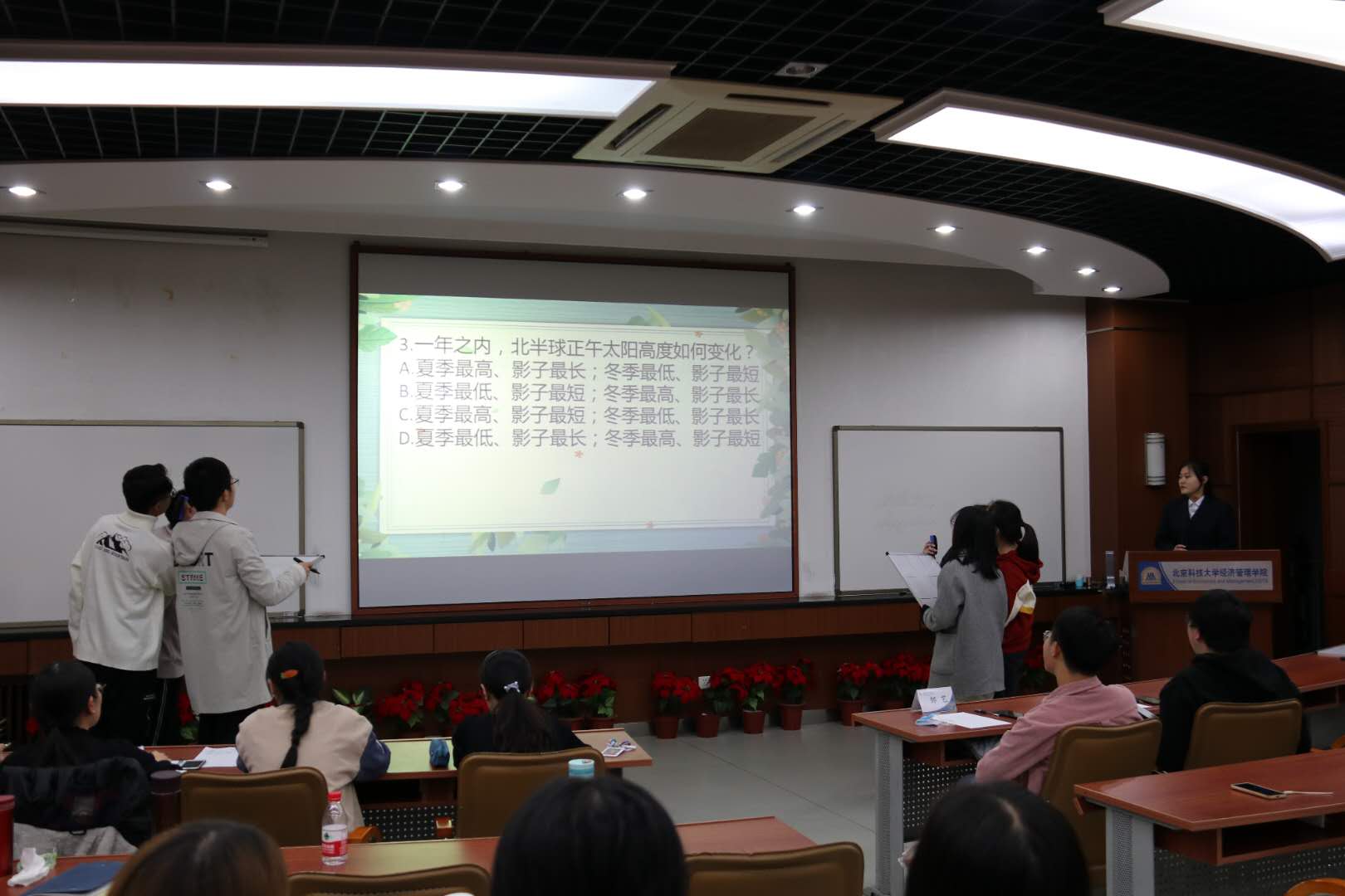 11月7日晚,第四届“答题吧少年”百科知识竞赛江南在线注册分站赛在经管楼313举行。本次活动是以班级对抗赛为基础,面向全体大一新生举办的大型百科知识竞赛,题目分为选择题和填空题,共两个环节,涉及文学、艺术、科技、体育、地理、历史、校园文化等多方面的内容,考察范围非常广泛,题目难度也有很大跨度。
