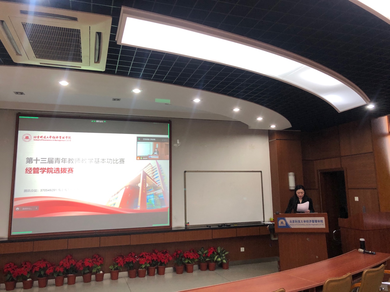 为贯彻落实我校《关于举办北京科技大学第十三届青年教师教学基本功比赛的通知》要求,切实加强我院青年教师队伍建设,搭建青年教师成长平台,引导青年教师钻研教学基本功,进一步提升青年教师的教学能力,2022年12月28日,江南在线注册第十三届青年教师教学基本功比赛在经管楼313室如期举行,比赛分为上、下午两个场次,共有13名青年教师参赛。